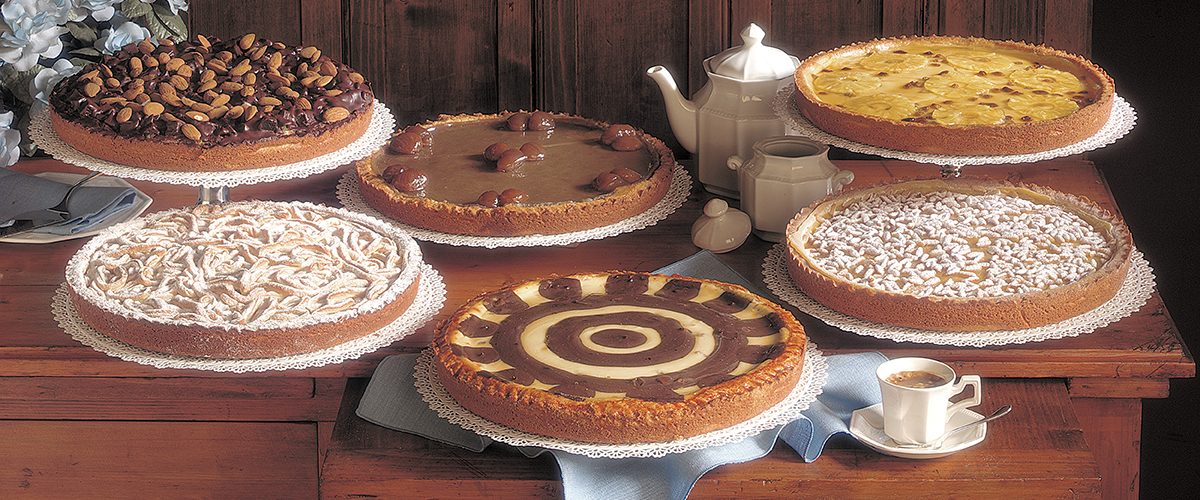 Base di pasta frolla ripiena di cubetti di mela e pan di Spagna tostati in forno e amalgamati a crema pasticcera al cioccolato e cannella. Infine lucidata con gelatina di albicocca.